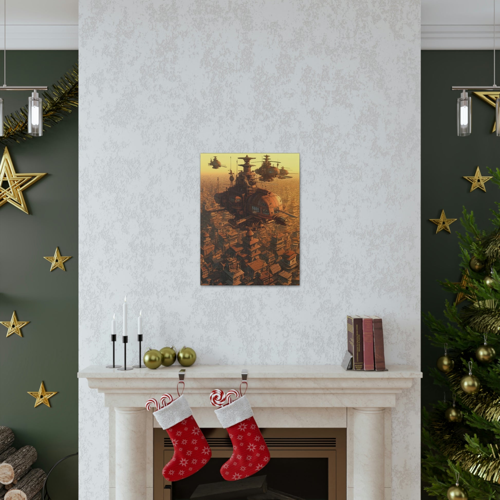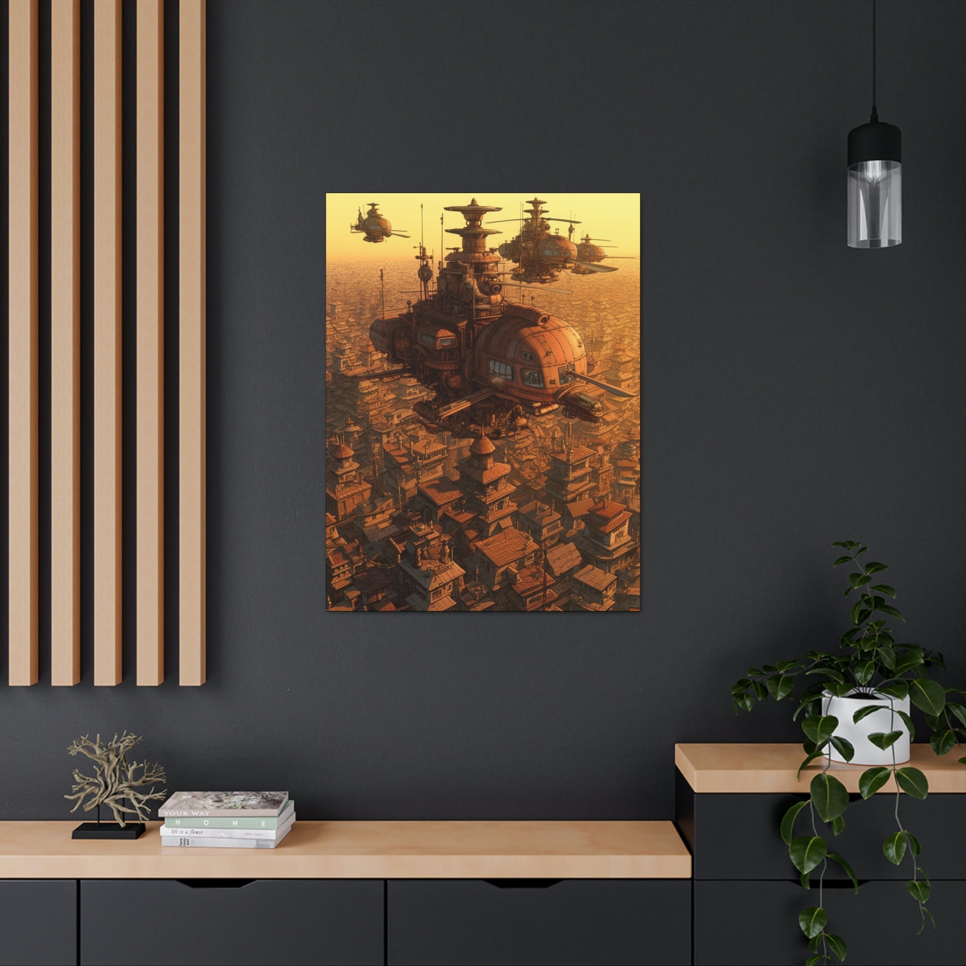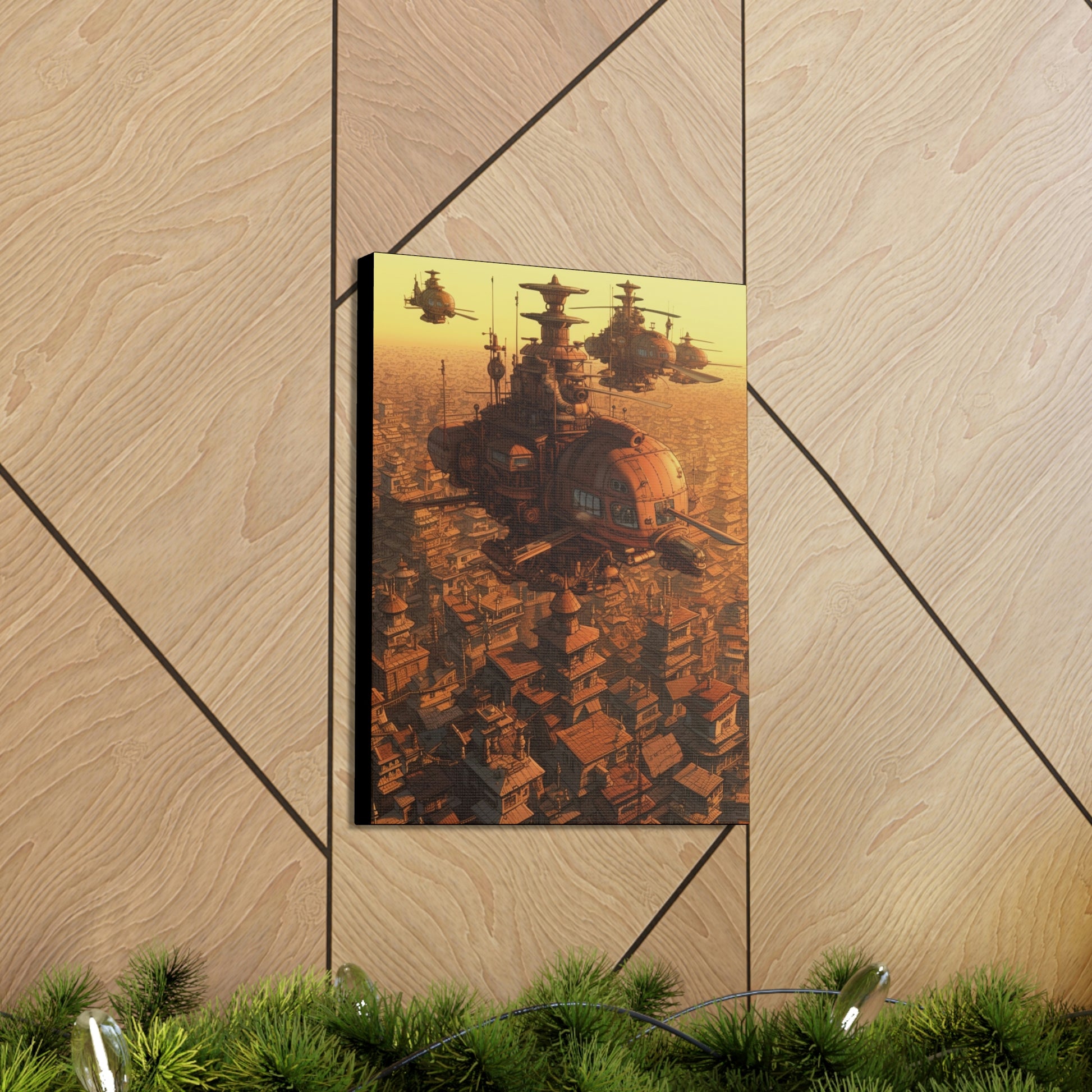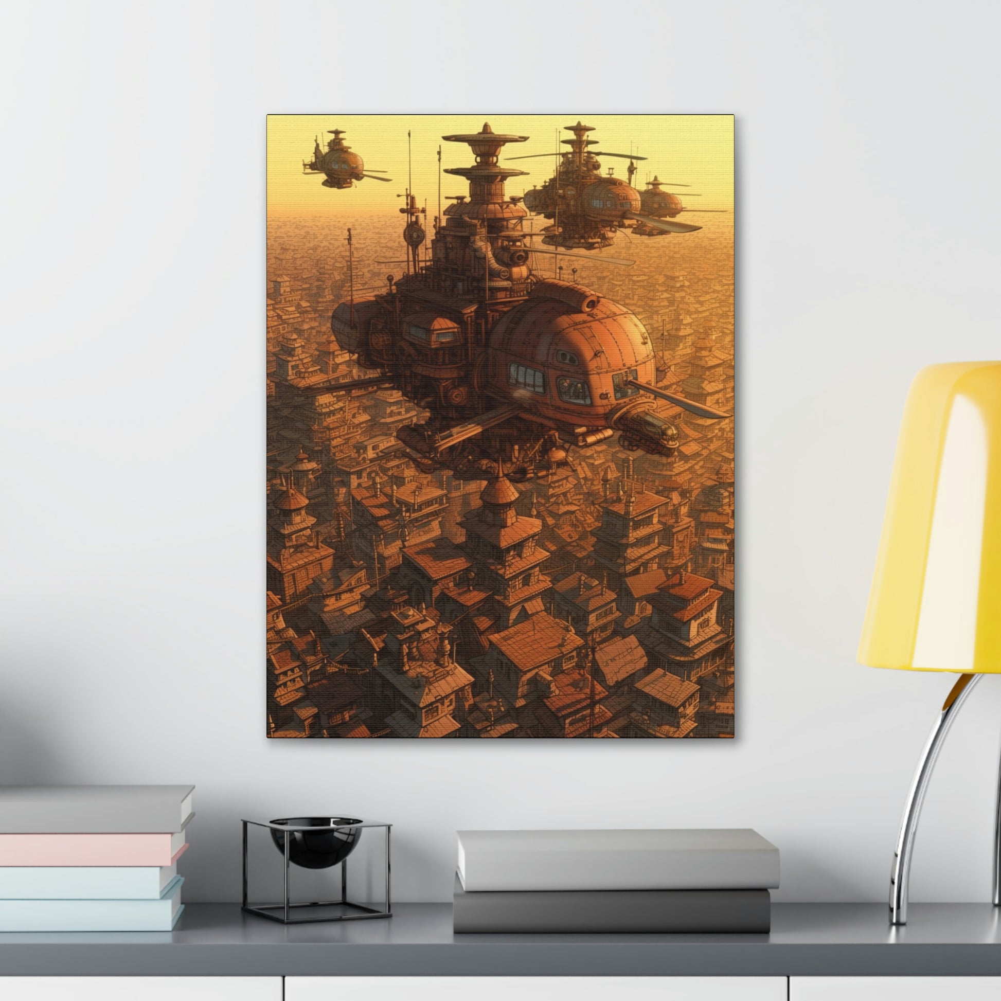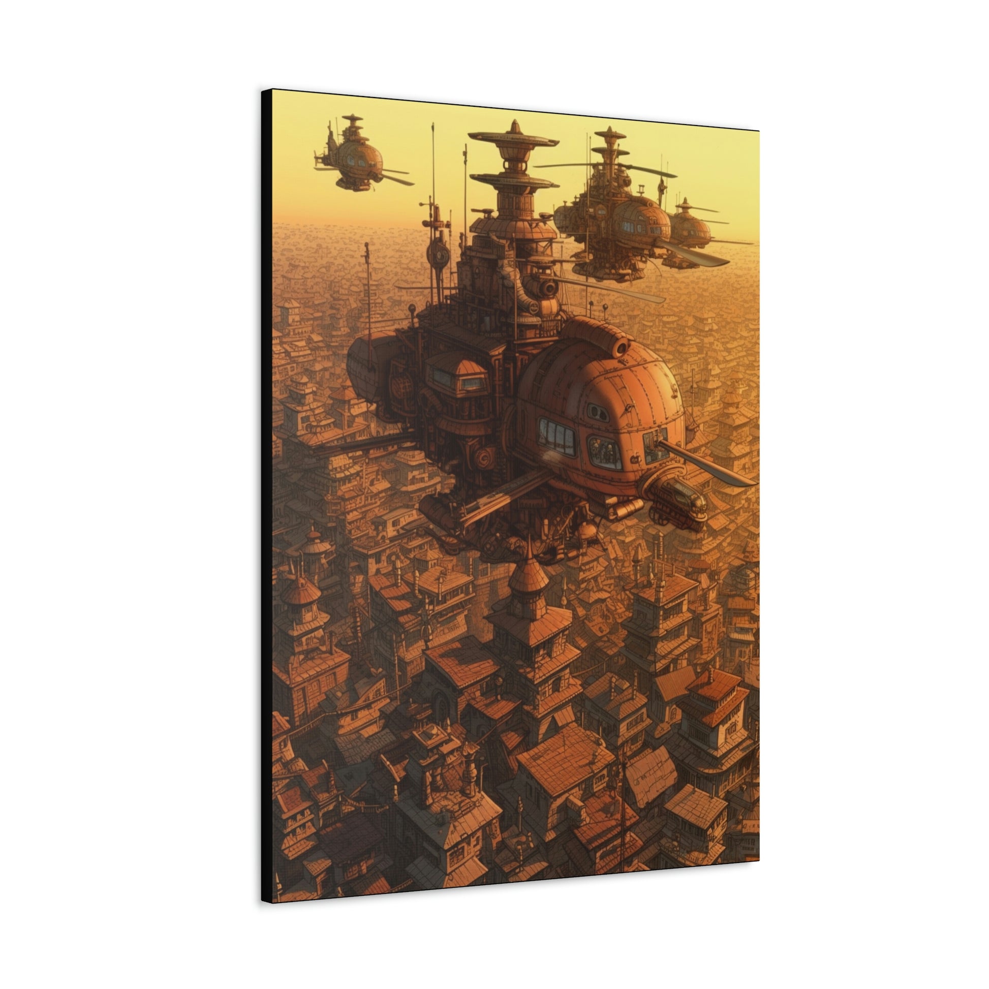 Uplift any room's decor with Aerial Steampunk Helicopter Squadron Wall Art that's printed on top-quality canvas gallery wraps. Each wrap is made with finely textured, artist-grade cotton substrate which helps reproduce your image in outstanding clarity and detail. Available in multiple sizes, these closed back canvases are built with a patented, solid support face and are excellent for indoor use.