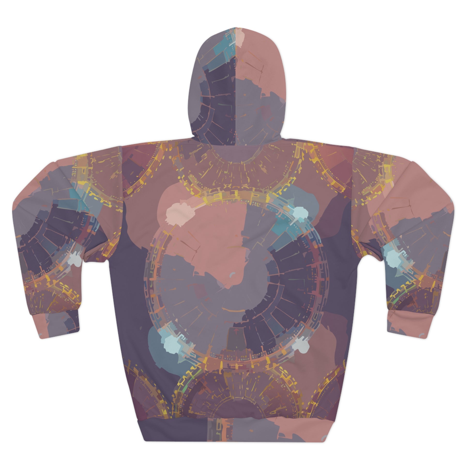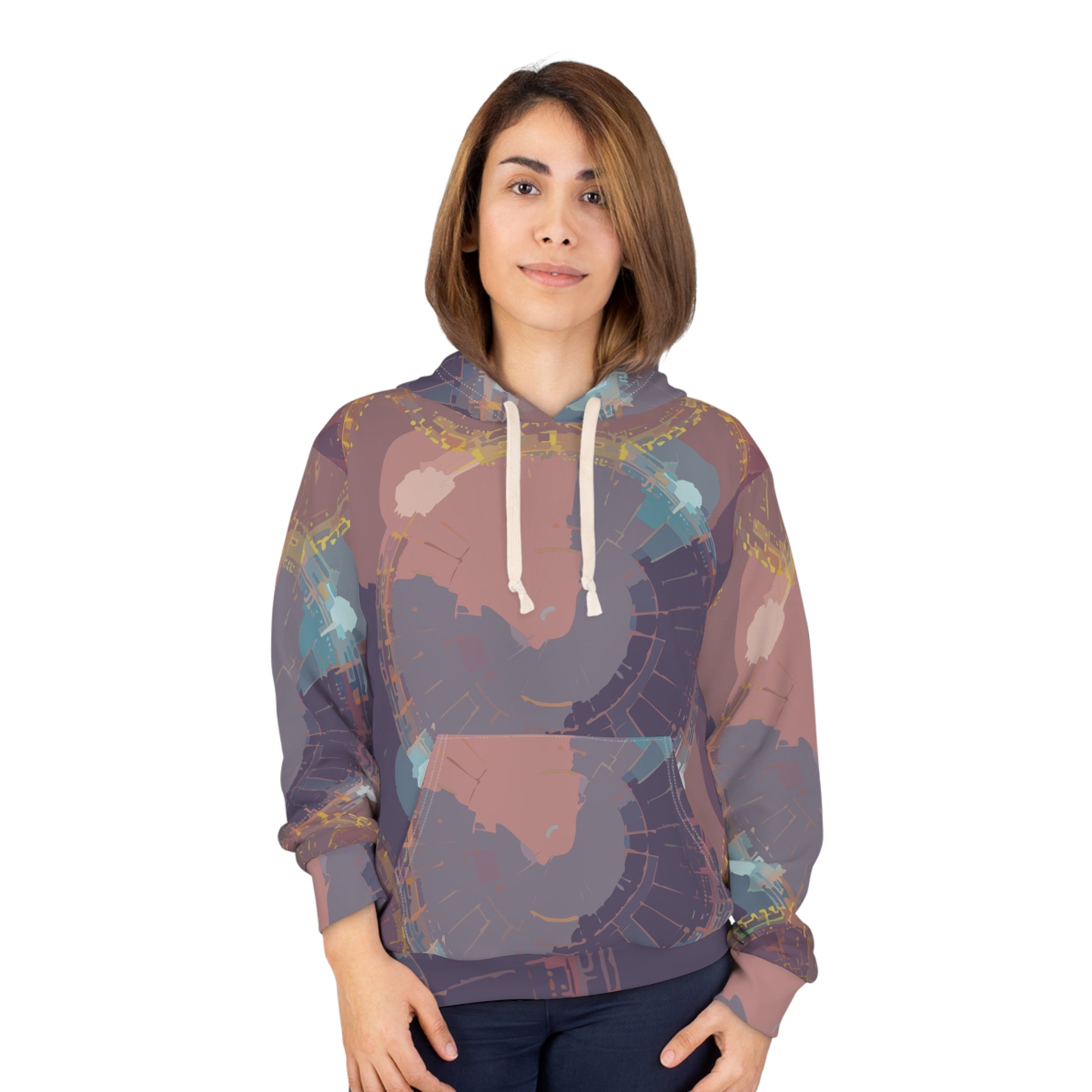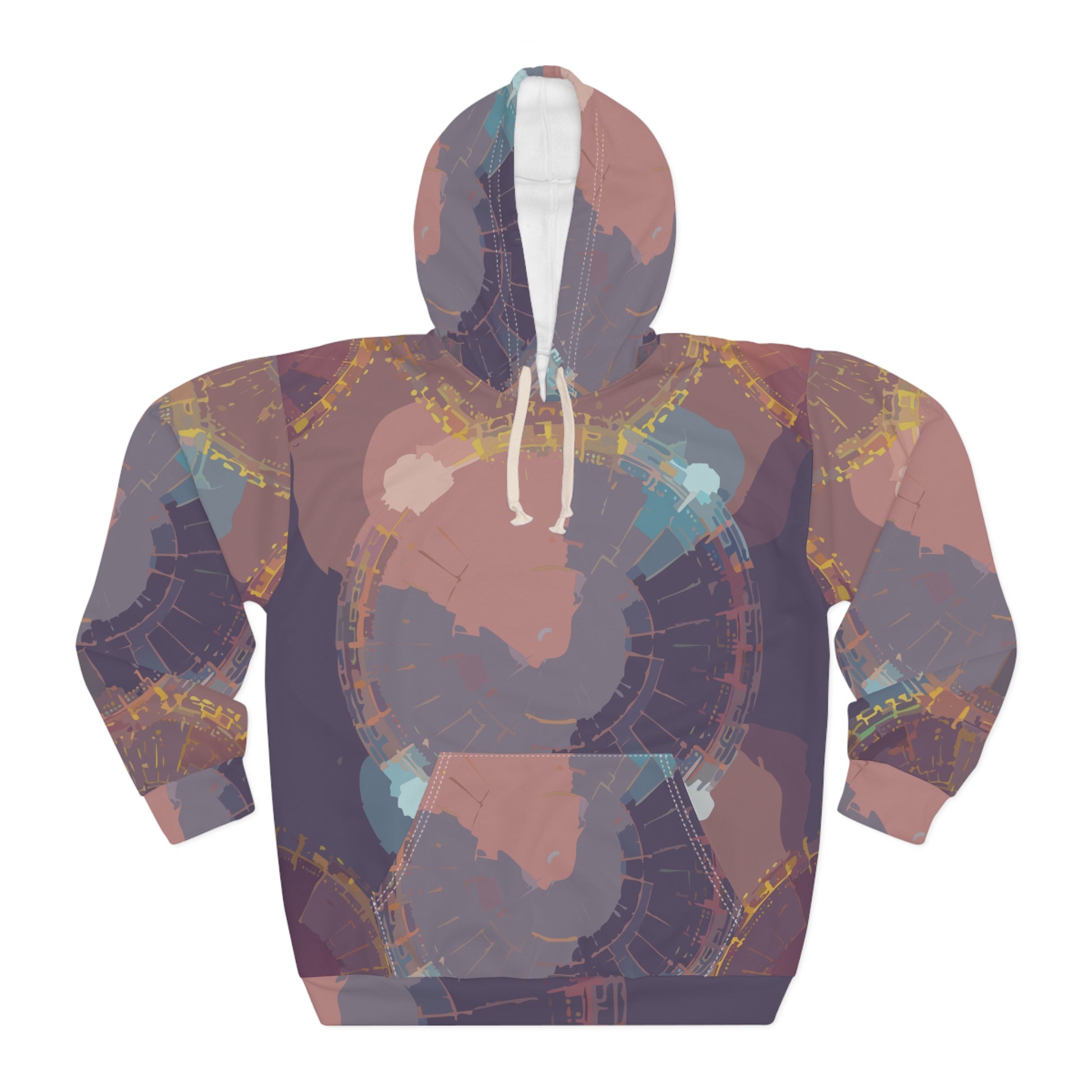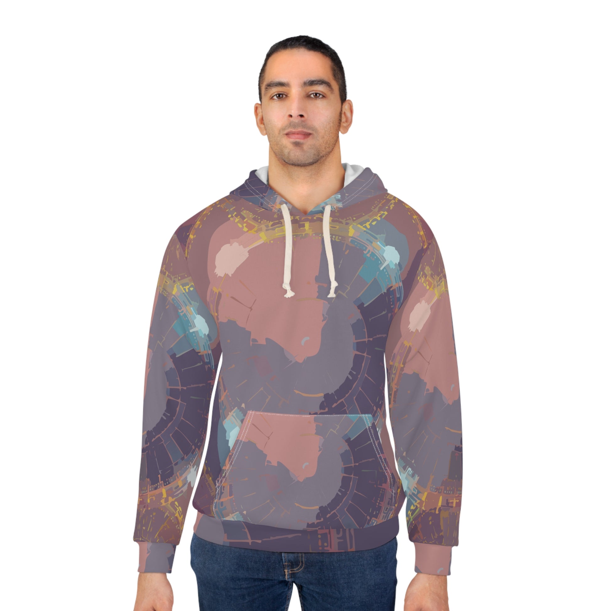 This all-over print pullover wraps you in a quiet, artful mood. Softly muted concentric shapes and dusty rose, slate, and teal washes feel like a late-evening studio glow — introspective, warm, and quietly inventive. The roomy kangaroo pocket and adjustable hood make it a go-to for slow walks, coffee-shop sketch sessions, or laid-back studio nights. It layers easily over tees and flannels, pairing with worn denim or joggers for a lived-in, creative look that nods to thoughtful, handcrafted style.